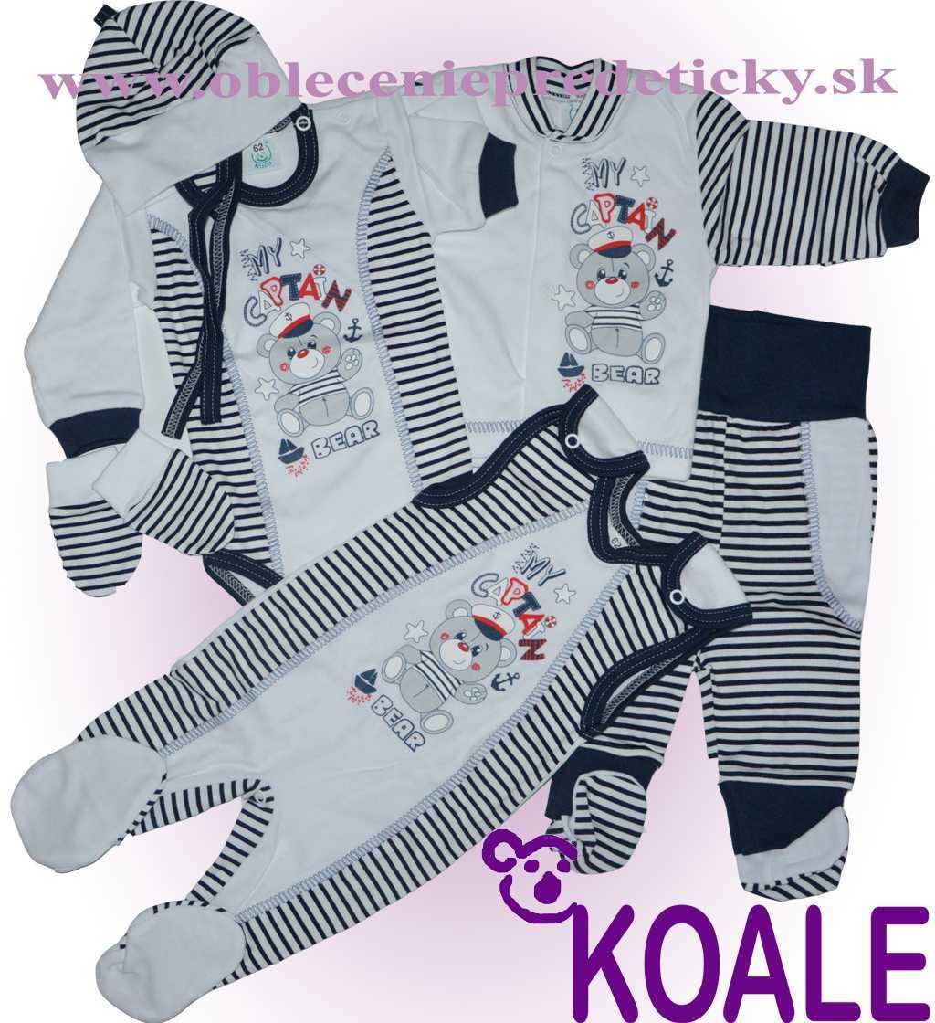 Značka: UŚMIECH DZIECKA (PL), 100 % bavlna. Námornícke oblečenie pre bábätká s námorníckym motívom macko Captain a páskovým vzorom. 6-dielna súpravička: dupačky s rozopínaním medzi nôžkami, kabátik rozopínaný pomocou cvočkov, body s dlhým rukávom, čiapočka so zaväzovaním, rukavičky a polodupačky so širokým pásom. Vkusná kombinácia farieb s moderným námorníckym vzorom, zapínanie na cvoky. Súpravička vo výbornej kvalite za primeranú cenu.